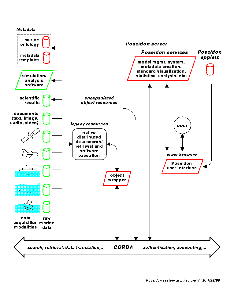 Poseidon is an executive system for coastal zone management. Poseidon will be used to construct and execute complex scientific workflows composed of distributed oceanographic resources, both data and programs. We will use CORBA as a software backbone or bus to provide transparent communications between the various pieces of the system. On the server side, newly developed data or software resources can be directly encapsulated as CORBA-compliant objects. Legacy resources will require an object wrapper front-end connected to a back-end that will interact with the resource using the appropriate explicit mechanism.